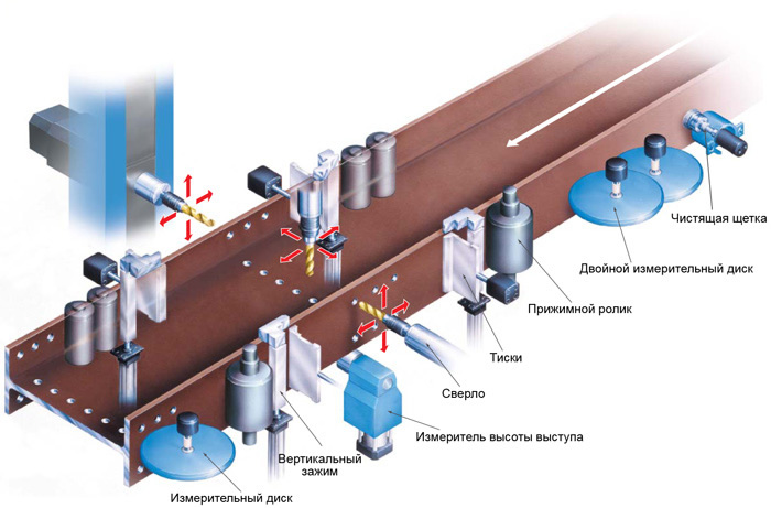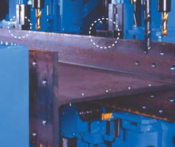 Четыре вертикальных гидравлических зажима надёжно держат заготовку, чтобы выпрямить незначительно изогнутые балки и избежать возможного изгиба заготовки.