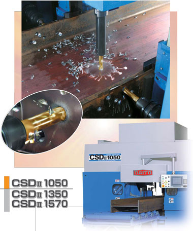 Никогда раньше твердосплавные наконечники сверл не использовались для конструкционного сверления стали из-за их хрупкости. В настоящее время Daito разработало новую серию высокоскоростного оборудования серии CSD, в котором используются твердосплавные наконечники свёрл. Новые Daito станки серии CSD отличаются мощными 15 кВт роторными моторами и исключительно устойчивой конструкцией, которая позволяет производить сверление в 4.6 раза быстрее чем обычно. Расходы эффективно сокращены удивительной производительностью и более того стоимостью инструментов. Особенностью станков Daito является уникальный метод ‘‘X-Y позиционирование 3 свёрл’’ и их полная изоляция, что обеспечивает безопасность и чистоту окружающей среды.